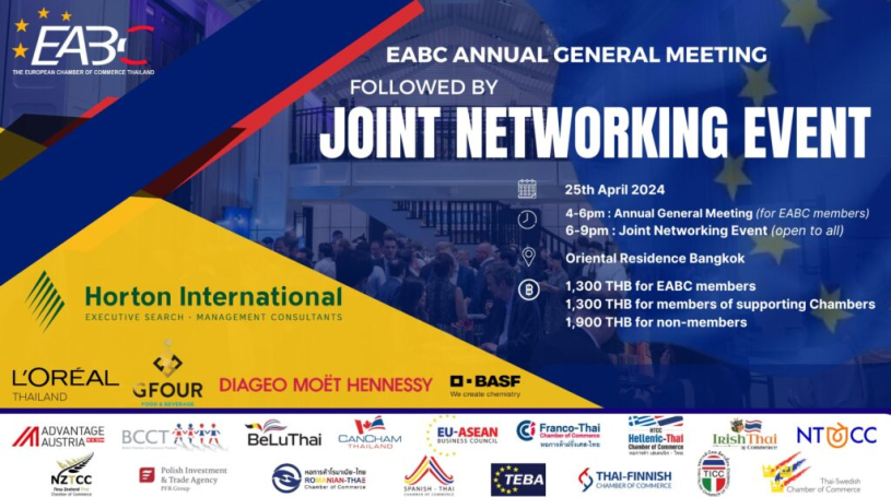TICC is glad to co-organize and support the EABC’s Annual General Meeting followed by a Joint Networking Event, which will be held on Thursday, 25 April 2024, at Oriental Residence Bangkok.
