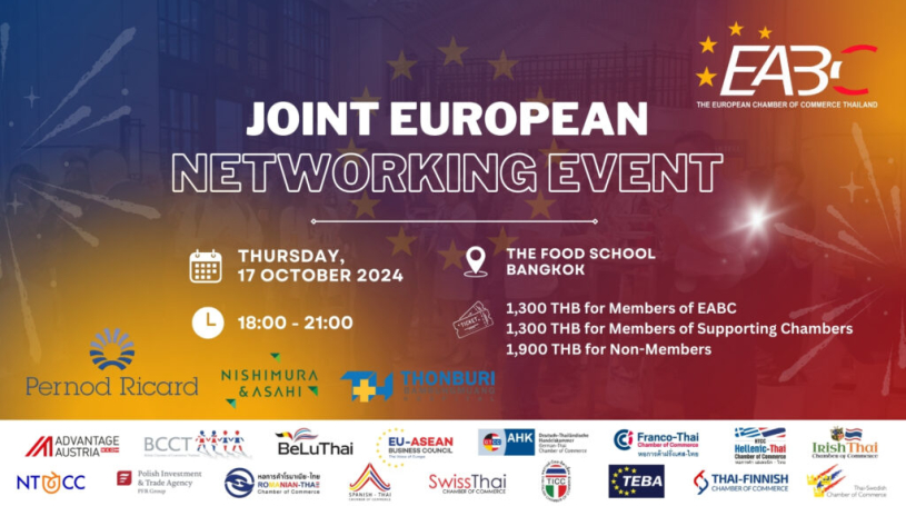 We are delighted to invite you to EABC Joint European Networking Event on Thursday, 17 October 2024, 18.00-21.00 at The Food School Bangkok. The event is in close collaboration with several European bilateral Chambers of Commerce in Thailand, thus giving you the opportunity to network with business communities from all across Europe.