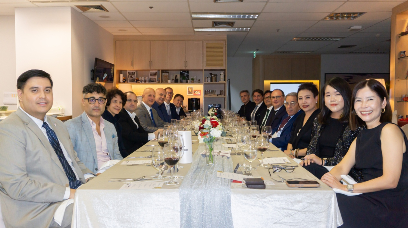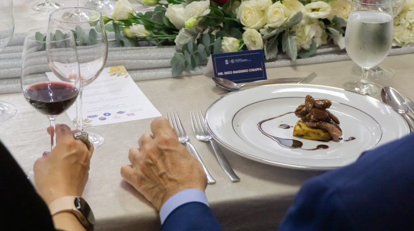 Guests enjoyed an exceptional Italian dining experience, generously sponsored by Cirio, represented by Mr. Francesco Cioffi. The evening’s menu, curated and prepared by iO Italian Osteria, featured a selection of authentic dishes perfectly paired with fine wines from GFour and TGW. Mr. Paolo Conselvan, founder of TGW, personally guided the tasting, sharing his passion and insights into Italy’s rich winemaking tradition. To complement the dinner, Global Food Products provided Acqua Panna and San Pellegrino, adding a refined touch of Italian elegance.