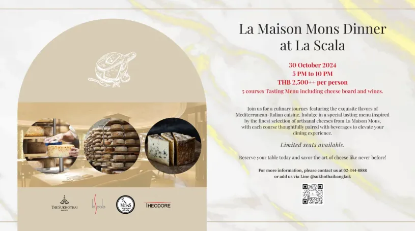 Donโt miss this opportunity to experience the rich culinary heritage of Italy, paired with world-class cheese and wine, in one of Bangkokโs most elegant venues.