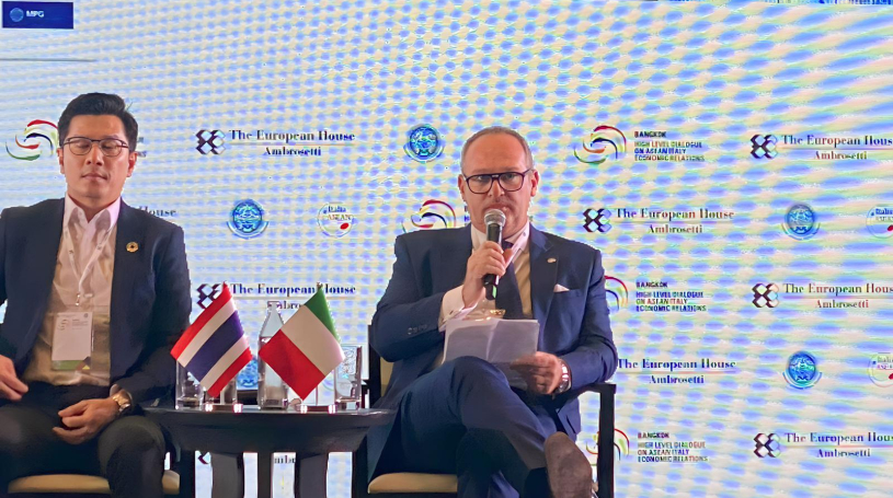 Mr. Valentino Valentini, Deputy Minister of Enterprises and Made in Italy, who flew directly from Rome to attend this important event, stated that ASEAN is a very vibrant part of the world, which has seen impressive economic growth after the pandemic despite the challenges in the region. Talking about the Green Transition ahead, Minister Valentini also argued that Italy and Thailand, along with all ASEAN countries, should look forward to the Green transition ahead as an important opportunity to develop further in more innovative and strategic fields for the future.