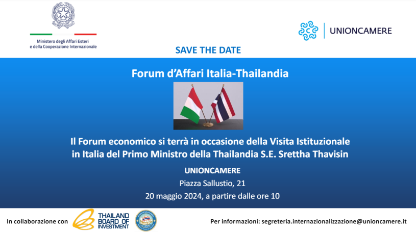 sperando di fare cosa gradita, desideriamo anticipare che Unioncamere e il Ministero degli affari esteri e della cooperazione internazionale organizzano nella mattinata del prossimo 20 Maggio, a partire dalle ore 10, un Forum d’Affari Italia-Thailandia, in occasione della visita istituzionale del Primo Ministro della Thailandia, S.E. Srettha Thavisin.