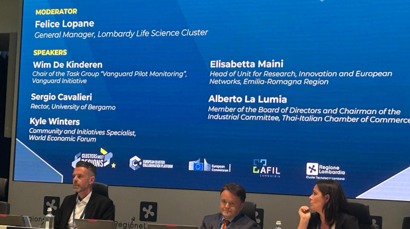 The panel discussion featured other distinguished representatives from local institutions: Mr. Sergio Cavalieri, Rector of the Università degli Studi di Bergamo; Mr. Wim De Kinderen, Chair of the Task Group "Vanguard Pilot Monitoring"; Mrs. Maini Elisabetta, Head of the Unit for Research, Technology Transfer, and Innovation Promotion from Emilia-Romagna Region; and Mr. Kyle Winters, Community and Initiatives Specialist from the World Economic Forum.