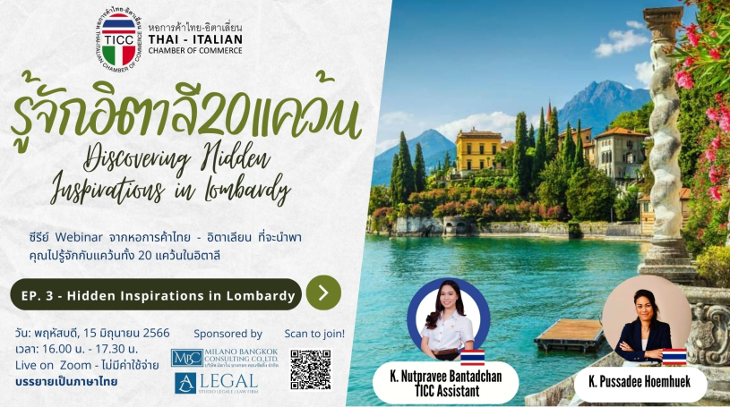 The third episode of the series was broadcast on 15 June 2023, featuring "Lombardy" with Ms. Pusadee Hemheuk, Manager of Milano Bangkok Consulting Co., Ltd. (https: http://allegal.eu/)